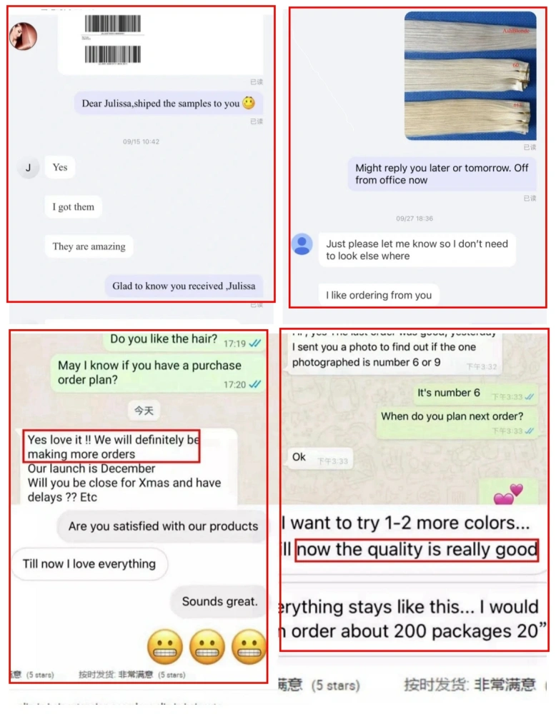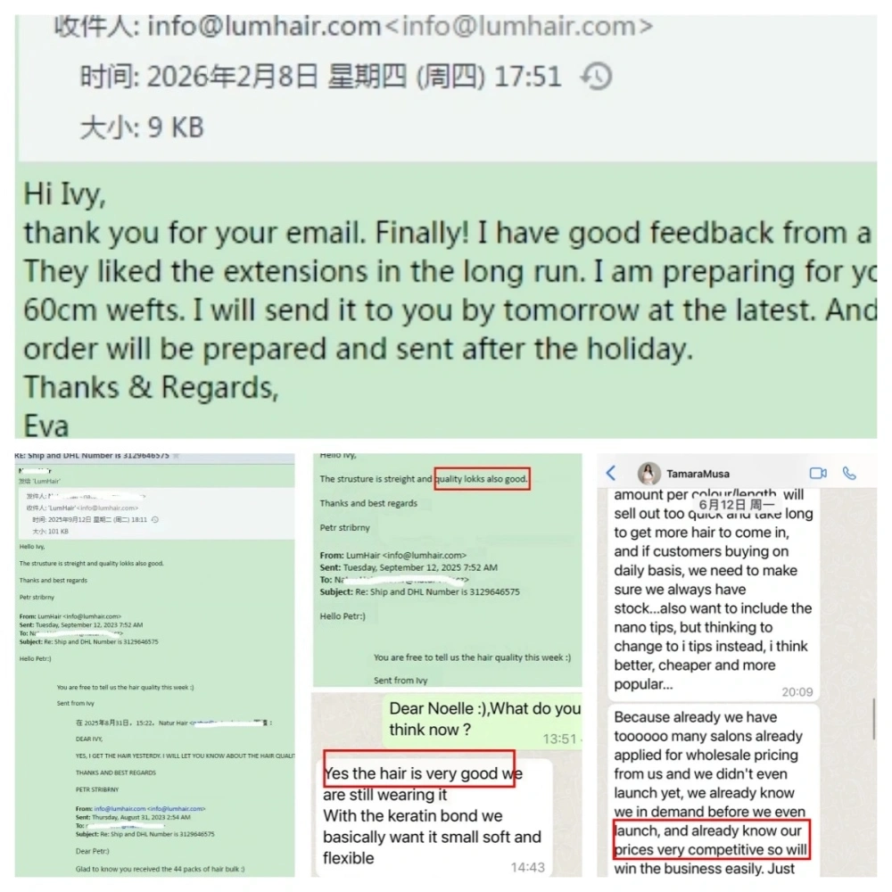 Lum Hair の顧客は、英国、米国、カナダ、オーストラリア、デンマーク、ニュージーランド、ノルウェー、ドイツ、フランス、オランダ、スウェーデン、ポーランド、チェコ共和国、スロバキアなどに広がっています。アイビーは営業マネージャーとして、良好なコミュニケーションを図るために流暢な英語を話すことができます。当社の主な販売市場:北米西欧オセアニア中央ヨーロッパ南アメリカ北欧